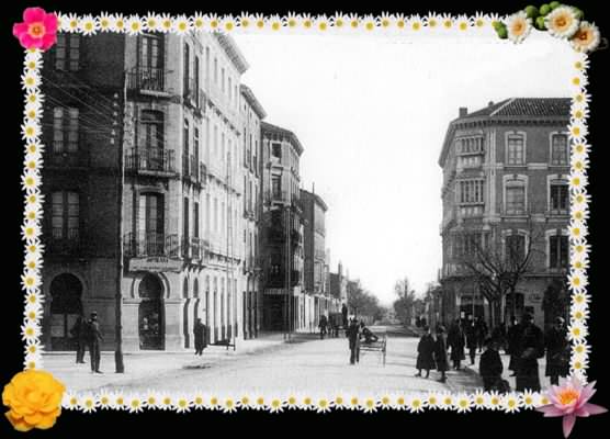 Fotografía tomada desde la misma Plaza de Navarra, en la que se ve lo poco que hay construido de la calle de Zaragoza; tan apenas lo que fué la imprenta Aguarón (hoy un Banco) y el edificio del Aero Club (hoy desaparecido). |