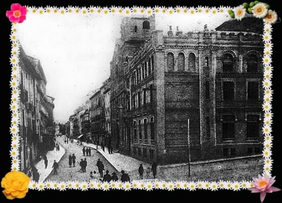 Esquina con la calle de Moya, se aprecia el edifico del antiguo Banco de España; este es final del primer tramo del Coso Alto, más adelante estará la Plaza de la Inmaculada, y ya en el último tramo, el teatro Olimpia.