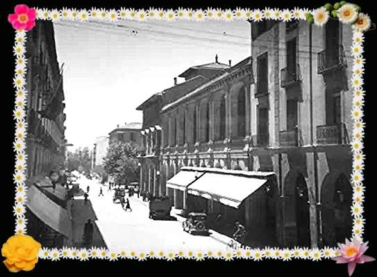 Una lejana visión del trayecto de los clásicos "Porches" con sus entoldados comercios y un casi inexistente tráfico; incluso vehículos estacionados. Al fondo, la Plaza de Navarra y una inexistente c/ de Zaragoza. |