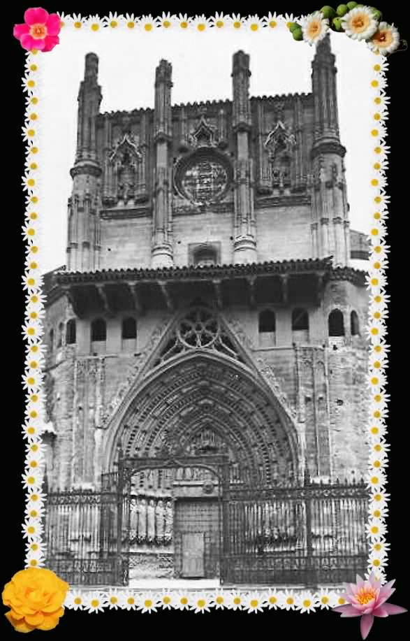 Portada de la catedral de Huesca, en la que se puede apreciar la existencia de una verja, hace años desaparecida y que fue causa de serias polémicas y discusiones por la eliminación de ese ornamento.