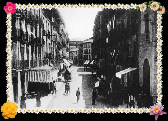 Primer tramo, desde las "4 Esquinas", hasta la intesección con la Plaza de San Lorenzo. Se aprecia una esquina de los Porches y la abundancia de toldos de los establecimientos comerciales, que aquí son la norma.